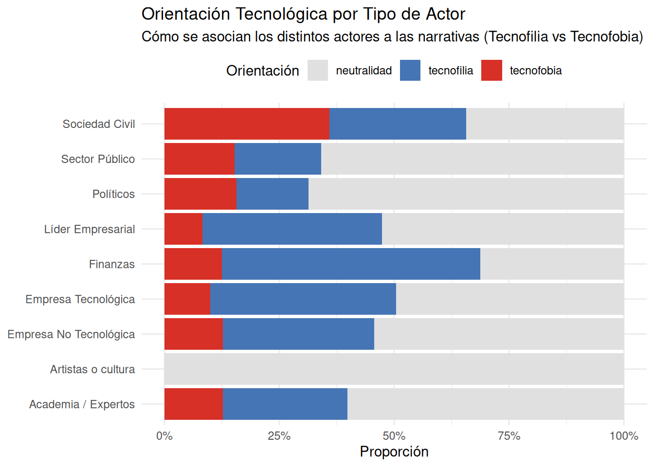 Hay muchisimas formas de explorar los resultados. El eje orientador son nuestros objetivos, nuestro marco teórico y nuestra imaginación. Podríamos utilizar algún modelo como tf_idf para ver conceptos más relevantes cuando aparecen ciertos actores o cuando hay cierta orientación tecnológica. También, podríamos realizar bigramas o palabras más frecuentes según tipo de actor, centralidad, medio, etc.